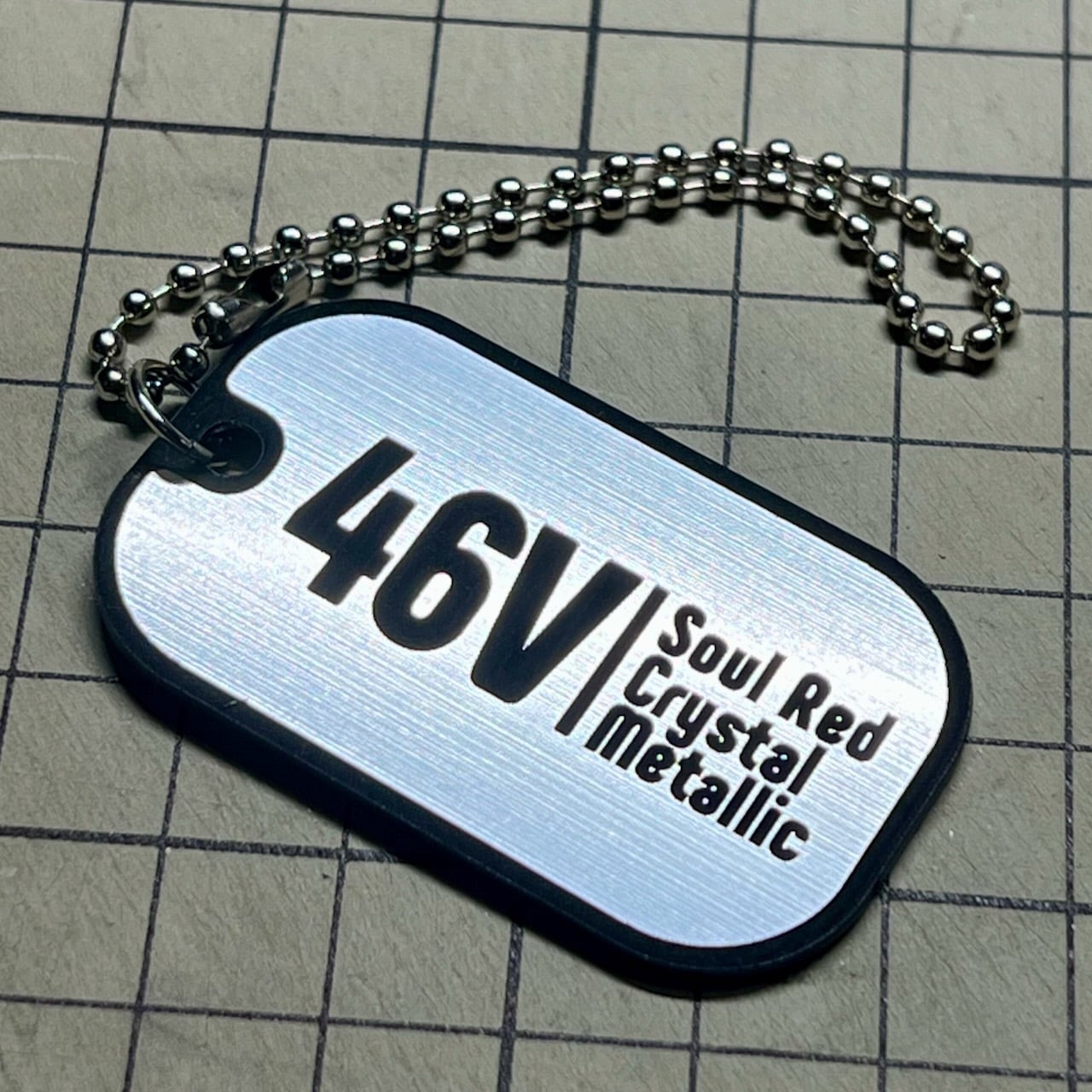マツダ・ロードスターの純正カラーコードを、高性能レーザー機で精密に刻印したタグキーホルダーです。
